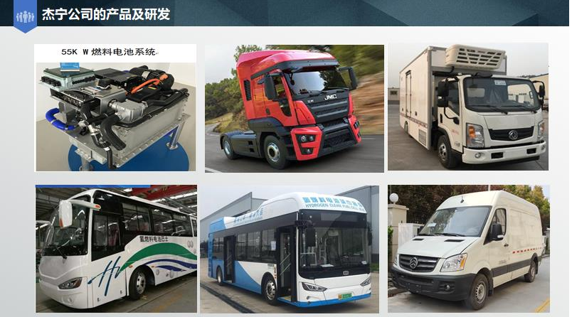 上海杰寧公司在氫燃料重型卡車、氫燃料客車、氫燃料物流車領(lǐng)域已經(jīng)和汽車營運公司及整車生產(chǎn)企業(yè)簽署了具有法律效力的合作開發(fā)文件,同時進(jìn)行了大量的氫燃料電池車動力系統(tǒng)零部件供應(yīng)市場的研究,如大功率DCDC、高速空壓機(jī)電機(jī)等。公司與合作伙伴在2017年成功開發(fā)了9米氫燃料電池通勤車和10.5米氫燃料電池公交車,2019年成功開發(fā)了42噸燃料電池半掛牽引車。