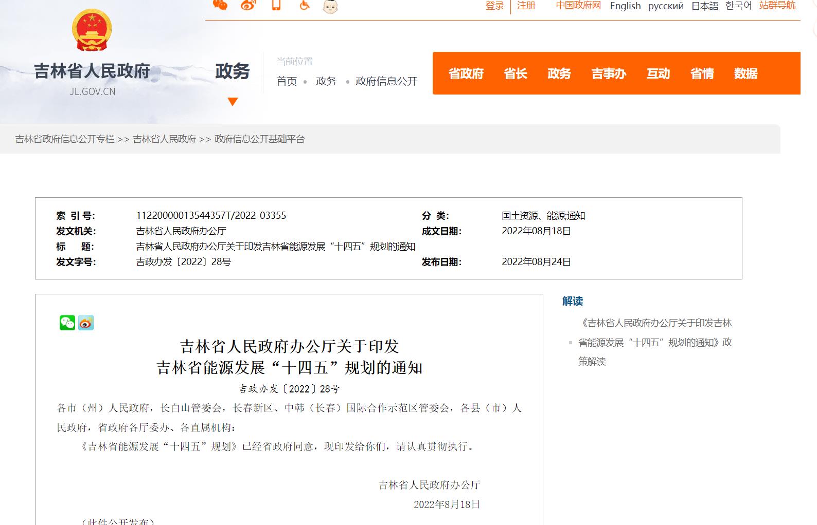 氫啟未來網(wǎng)消息,吉林省人民政府辦公廳在其官網(wǎng)發(fā)布關(guān)于印發(fā)《吉林省能源發(fā)展“十四五”規(guī)劃》的通知