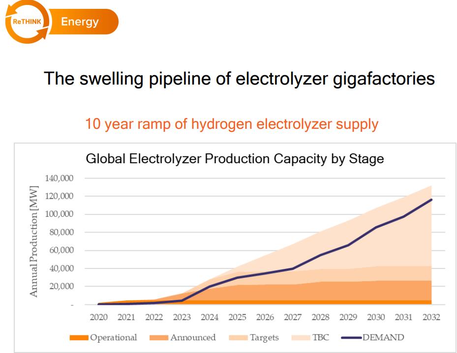 根據(jù)一份新的RethinkEnergy報告,將需要付出巨大的努力來建造足夠的電解槽超級工廠來滿足綠氫熱潮。在過去三年的一系列公告中,工廠管道膨脹到使該行業(yè)有望在未來五年內(nèi)滿足需求的水平。“保持這種勢頭對于隨后的綠氫能激增至關(guān)重要,”它指出。該報告預(yù)計,到2050年,全球氫氣需求將增長10倍,達到7.35億噸,其中幾乎所有這些都是通過電解生產(chǎn)的。