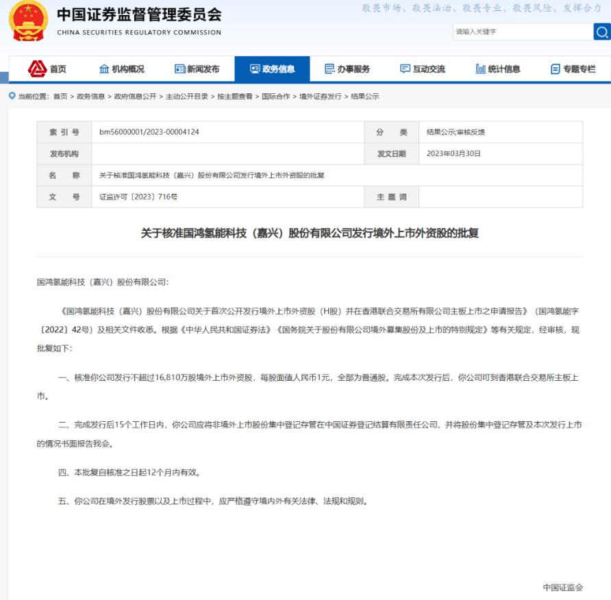 氫啟未來網獲悉,3月30日,中國證券監督管理委員會官網發布了一份重要文件:《關于核準國鴻氫能科技(嘉興)股份有限公司發行境外上市外資股的批復》。這是根據《中華人民共和國證券法》和《國務院關于股份有限公司境外募集股份及上市的特別規定》等相關規定進行的審核。
