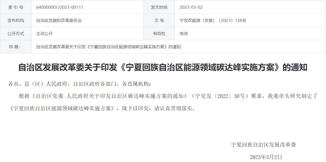 氫啟未來網獲悉,3月2日,寧夏回族自治區發展和改革委員會印發《寧夏回族自治區能源領域碳達峰實施方案》