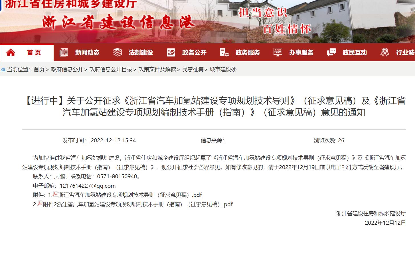 浙江省住房和城鄉建設廳組織起草了《浙江省汽車加氫站建設專項規劃技術導則(征求意見稿)》及《浙江省汽車加氫站建設專項規劃編制技術手冊(指南)(征求意見稿)》