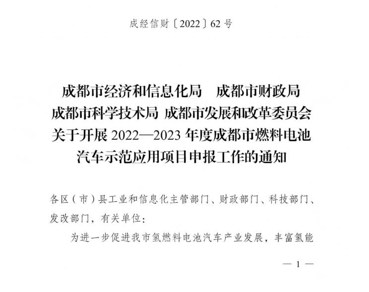 12月22日,成都市經濟和信息化局、成都市財政局、成都市科學技術局、成都市發展和改革委員會4部門聯合印發《關于開展2022-2023年度成都市燃料電池汽車示范應用項目申報工作》的通知。