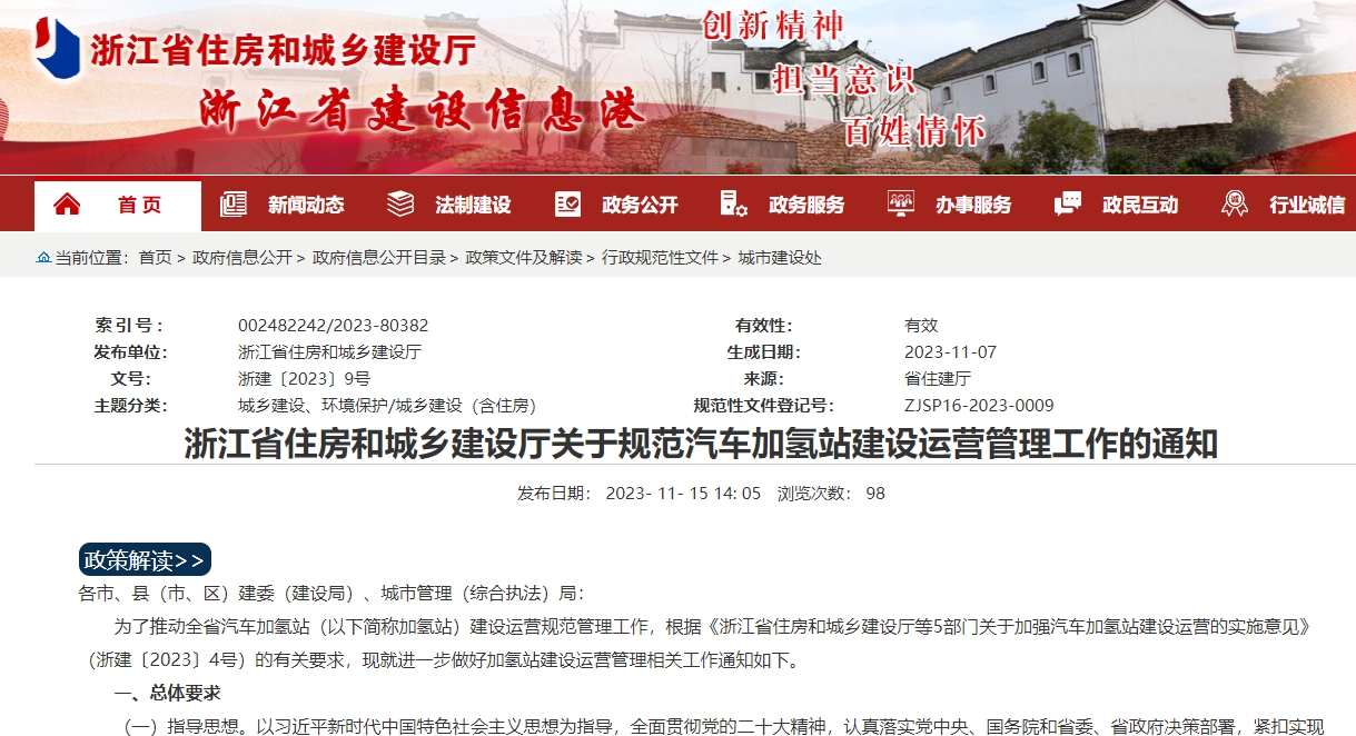 11月15日,為了推動浙江省汽車加氫站建設運營規范管理工作,根據《浙江省住房和城鄉建設廳等5部門關于加強汽車加氫站建設運營的實施意見》(浙建〔2023〕4號)的有關要求,浙江省住房和城鄉建設廳在其官方發布了《浙江省住房和城鄉建設廳關于規范汽車加氫站建設運營管理工作的通知》