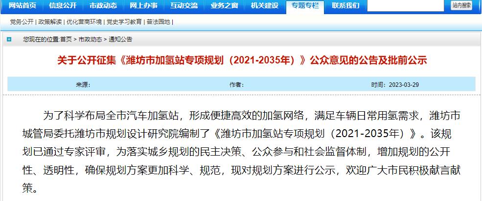 氫啟未來網獲悉,近日,為了科學布局濰坊市汽車加氫站,形成便捷高效的加氫網絡,滿足車輛日常用氫需求,濰坊市城管局委托濰坊市規劃設計研究院編制了《濰坊市加氫站專項規劃(2021-2035年)》。