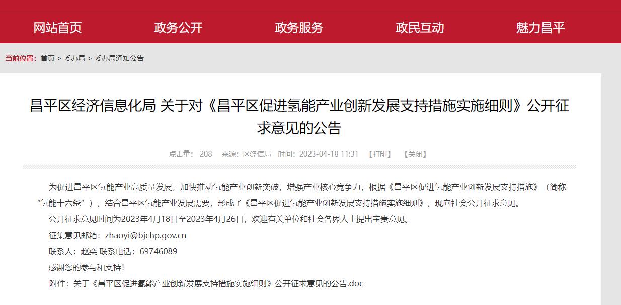 氫啟未來網獲悉,4月18日,北京市昌平區經濟信息化局發布《昌平區促進氫能產業創新發展支持措施實施細則》