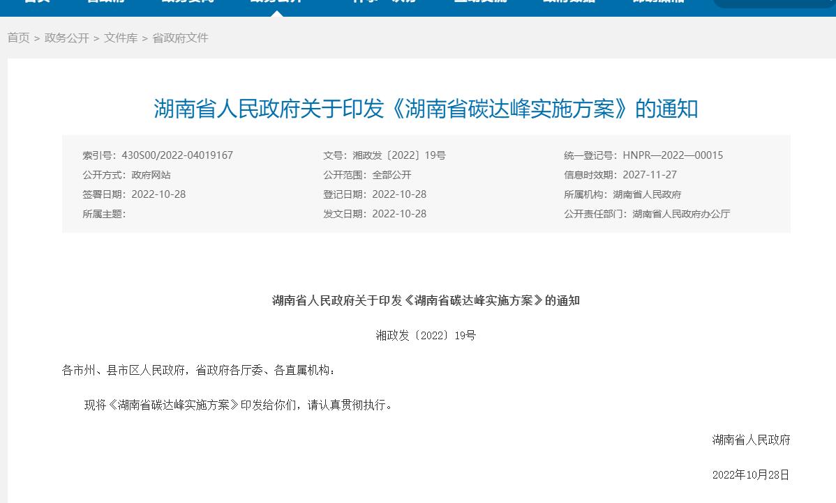 氫啟未來網獲悉,10月28日,湖南人人民政府發布關于印發《湖南省碳達峰實施方案》的通知