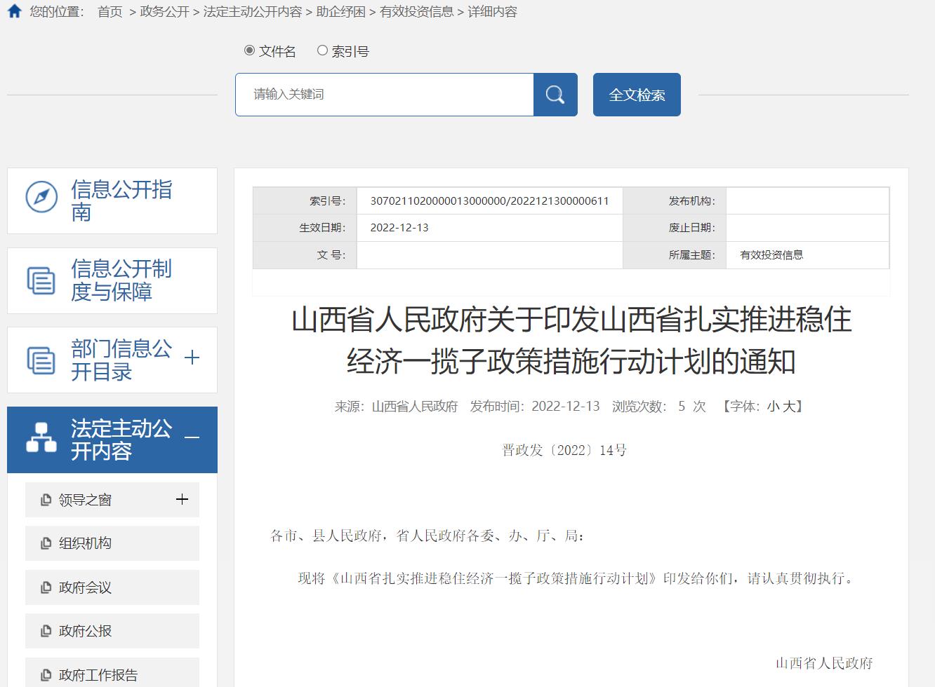 12月13日,山西省人民政府發布《山西省扎實推進穩住經濟一攬子政策措施的行動計劃》