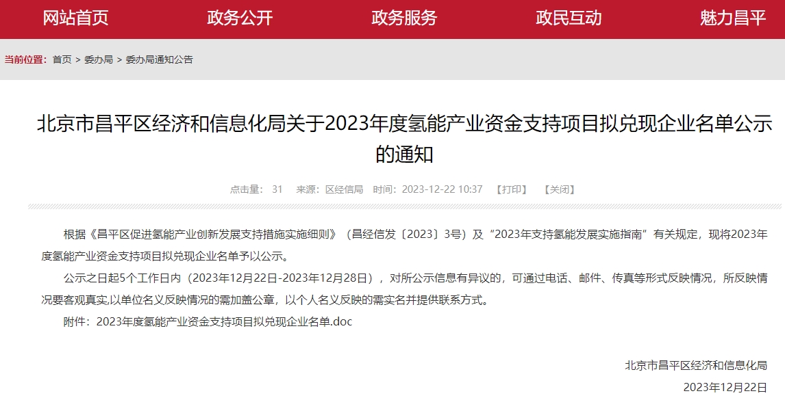 氫啟未來網獲悉,12月22日,北京市昌平區經濟和信息化局根據《昌平區促進氫能產業創新發展支持措施實施細則》(昌經信發〔2023〕3號)及“2023年支持氫能發展實施指南”有關規定,現將2023年度氫能產業資金支持項目擬兌現企業名單予以公示。