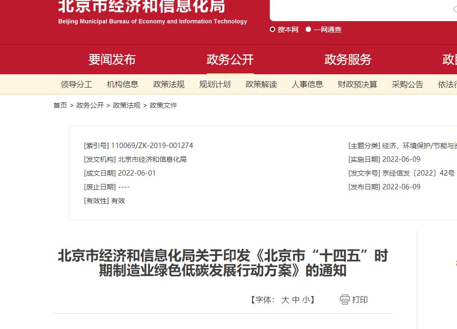氫啟未來網6月20日消息,近日北京市經濟和信息化局印發《北京市“十四五”時期制造業綠色低碳發展行動方案》