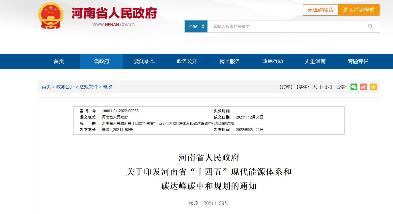 河南省人民政府關于印發《河南省“十四五”現代能源體系和碳達峰碳中和規劃》的通知