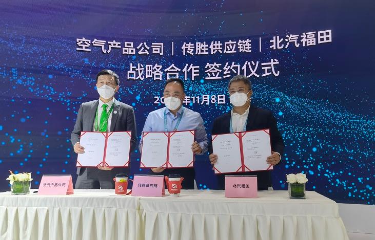 11月8日,風頭正勁的氫燃料電池車領域在進博會上迎來一樁喜訊,在空氣產品公司展臺,傳勝供應鏈管理(上海)有限公司、北汽福田汽車股份有限公司、空氣化工產品(中國)投資有限公司三方,分別作為甲乙丙方,簽署了戰略合作協議。