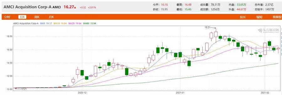 截至今日,AMCI股價一直在波段性上漲,從2020年12月起漲幅超過50%,從10美元升到16.27。