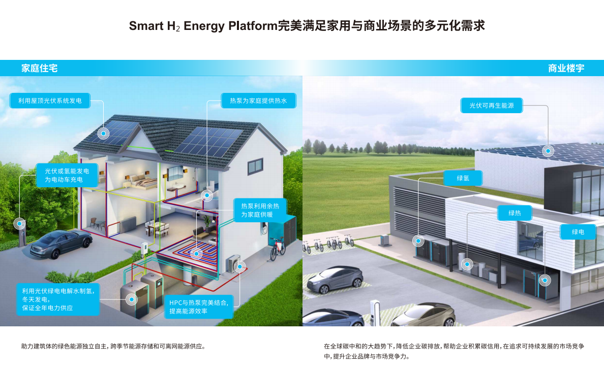 基于互補的技術與市場優勢,雙方將聚焦中東地區日益增長的清潔能源需求,重點在智慧氫能平臺展開深度合作。智慧氫能平臺是一個以氫能為核心的多能融合的綜合解決方案,包括光伏逆變器、電解水制氫系統、儲氫系統、燃料電池發電系統、輔助電能系統和協同控制模塊。其工作原理是利用光伏產生的綠電電解水制氫并儲存,儲存的綠色氫氣可以通過燃料電池發電轉化回電力,制氫和發電過程產生的余熱可作為熱泵熱源。