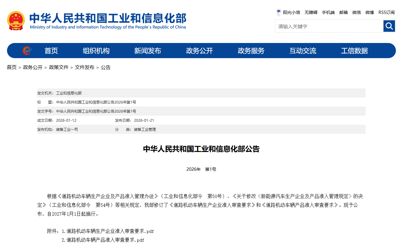1月21日,工信部發(fā)布了2026年第1號公告,修訂了《道路機(jī)動車輛生產(chǎn)企業(yè)準(zhǔn)入審查要求》和《道路機(jī)動車輛產(chǎn)品準(zhǔn)入審查要求》,自2027年1月1日起施行。《道路機(jī)動車輛生產(chǎn)企業(yè)準(zhǔn)入審查要求》和《道路機(jī)動車輛產(chǎn)品準(zhǔn)入審查要求》于2019年1月18日由工信部發(fā)布,確保只有具備足夠研發(fā)、生產(chǎn)、售后和安全保障能力的企業(yè),才能進(jìn)入市場造車?,是國家用來?管住汽車生產(chǎn)源頭、保障車輛安全和行業(yè)秩序?的一套核心規(guī)則,自2019年6月1日起實(shí)施。此次為第一次修訂,相較之前,新增了對新能源汽車包括氫燃料電池汽車在內(nèi)等多類型車輛的生產(chǎn)企業(yè)準(zhǔn)入審查要求和產(chǎn)品準(zhǔn)入審查要求。