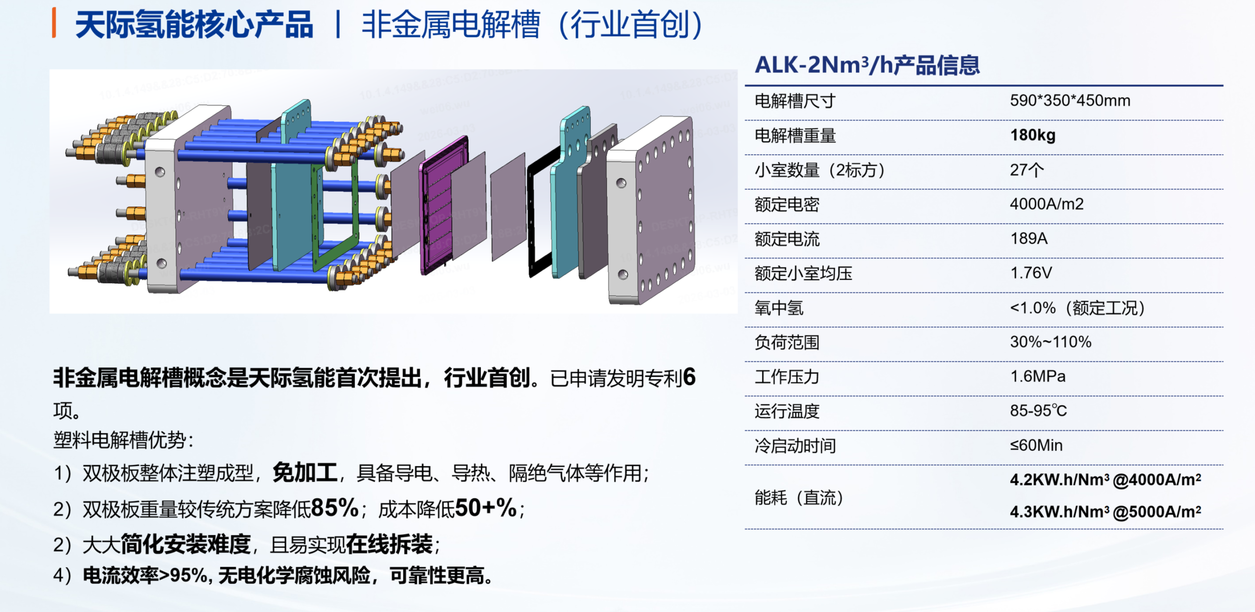目前,天際氫能非金屬電解槽(單槽ALK<5Nm3/h)通過多槽堆疊,可以實現大標方擴展,已實現可量產狀態。面向中大型制氫需求,天際氫能ALK-200Nm3/h非金屬電解槽原型機正加速開發中,預計2026年下半年實現量產。此舉將進一步拓展非金屬電解槽的應用邊界,滿足綠氫規模化制備的市場需求。