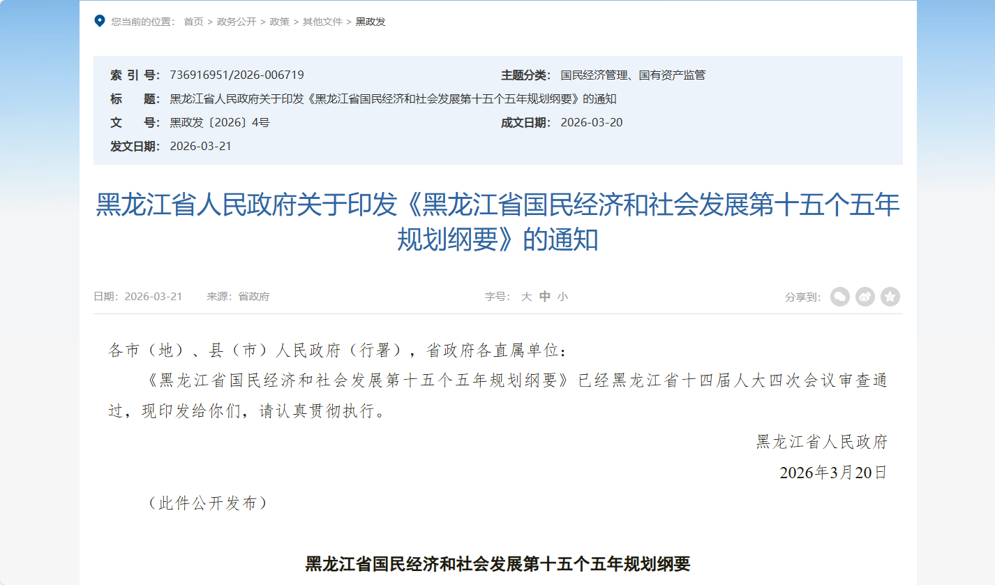 近日,黑龍江省人民政府發(fā)布《黑龍江省國民經(jīng)濟(jì)和社會(huì)發(fā)展第十五個(gè)五年規(guī)劃綱要》(以下簡稱“《綱要》”)。