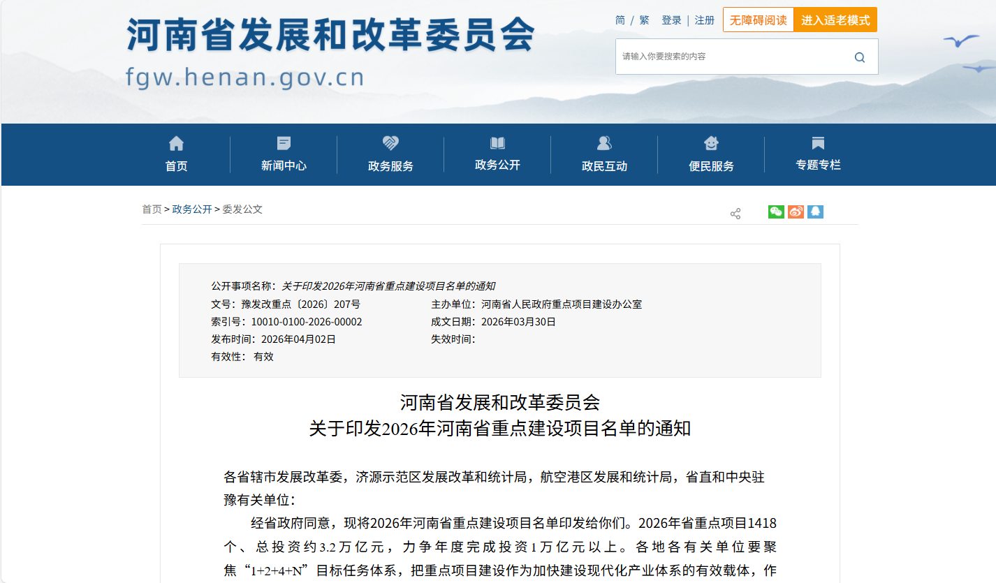 4月2日,河南省發(fā)展和改革委員會發(fā)布2026年河南省重點建設(shè)項目名單,2026年省重點項目1418個、總投資約3.2萬億元,力爭年度完成投資1萬億元以上。