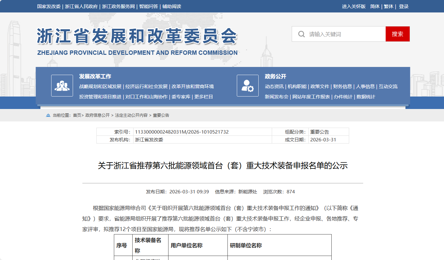 [ 導讀 ]3月31日,浙江省發改委公示推薦的第六批能源領域首臺(套)重大技術裝備申報名單,擬推薦12個項目至國家能源局,公示期限為2026年...