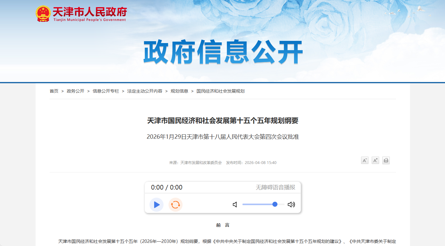 4月8日,天津市人民政府發布《天津市國民經濟和社會發展第十五個五年規劃綱要》(以下簡稱“《綱要》”),主要闡明天津市戰略意圖,明確政府工作重點,引導規范市場主體行為。