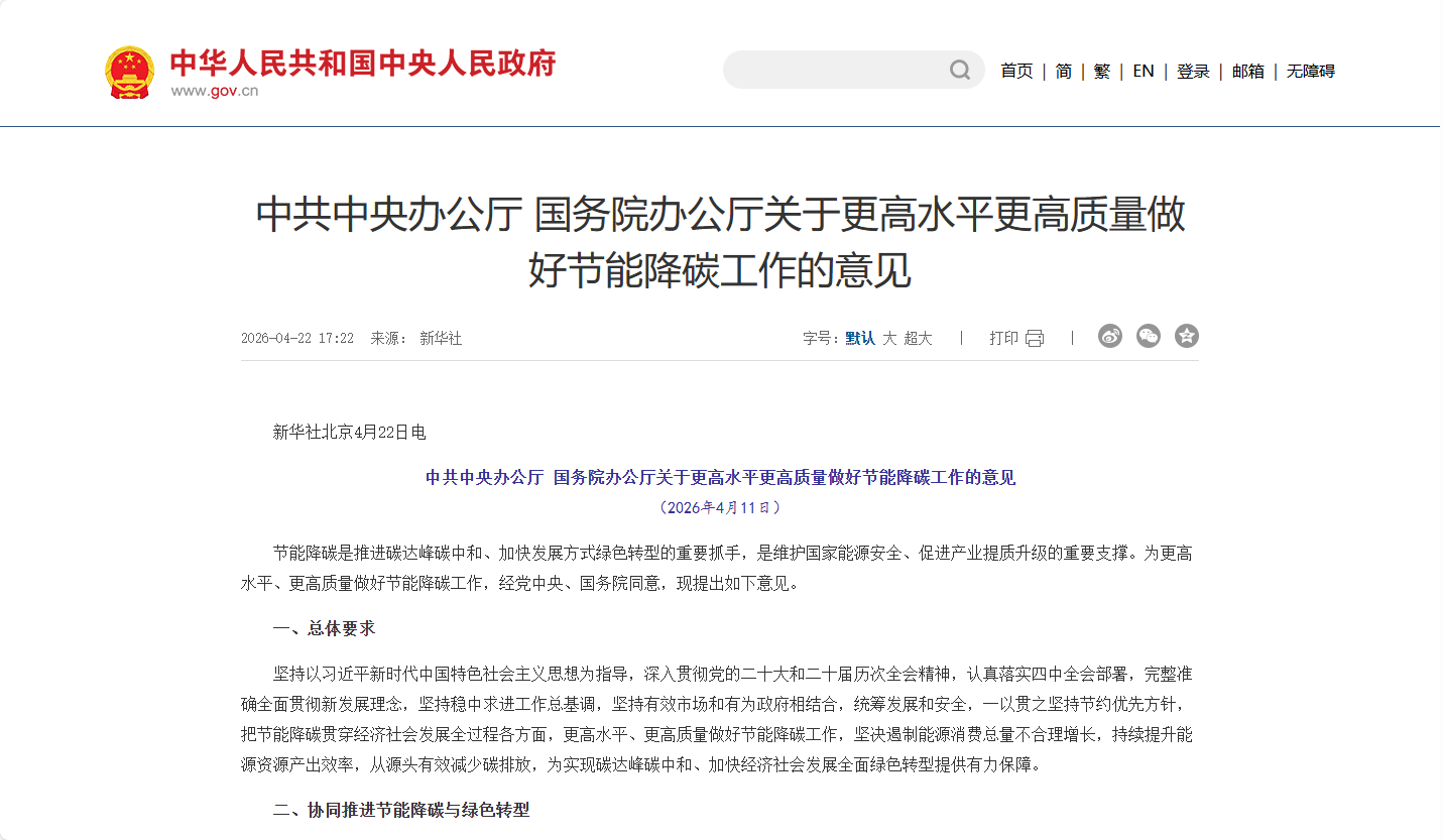 4月22日,中共中央辦公廳、國務院辦公廳發布《關于更高水平更高質量做好節能降碳工作的意見》(以下簡稱“《意見》”)。