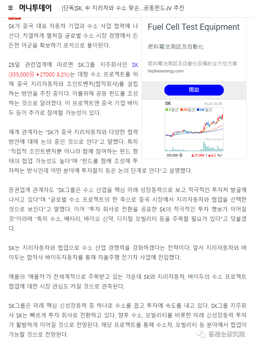 韓國SK集團聯(lián)手吉利、百度洽談氫能業(yè)務合作