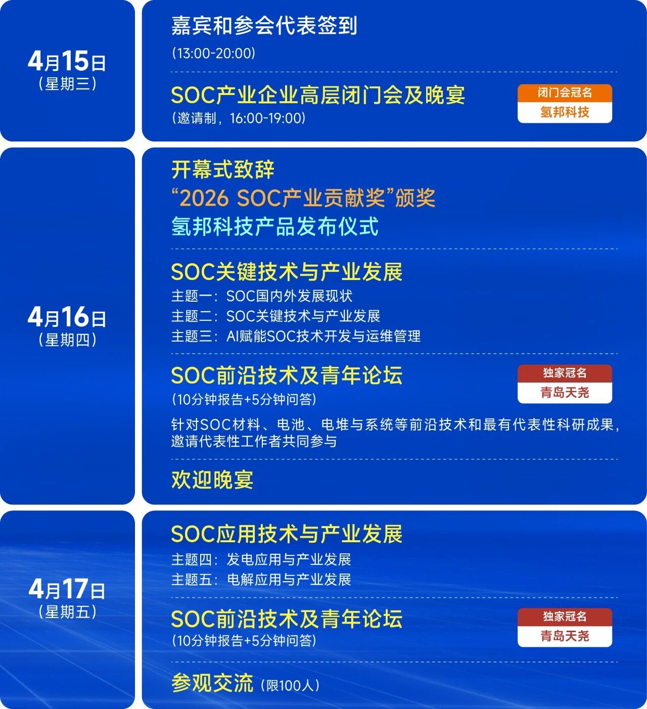 然而,當前SOC技術仍存在壽命與一致性亟需提升、產業規模化小與成本高等問題,產業鏈尚未完全成熟,商業化推廣面臨挑戰。為了推動固體氧化物電池產學研協同發展,加快產業化規模化應用,由DT新能源主辦,天府永興實驗室聯合主辦,西南石油大學、全省先進燃料電池與電解池技術重點實驗室、江蘇省可再生能源學會燃料電池專委會、雅安雅瓷氫化新能源科技發展有限公司協辦的2026(第六屆)固體氧化物電池技術發展與產業論壇將于2026年4月15-17日在四川成都舉辦。本屆論壇以“邁向SOC規模化零碳時代”為主題,邀請各大高校、科研院所、產業鏈上中下游代表性企業,對SOC產業中短期突破和長期發展作充分探討,加速打通產業鏈,為雙碳目標下的能源結構轉型貢獻力量。
