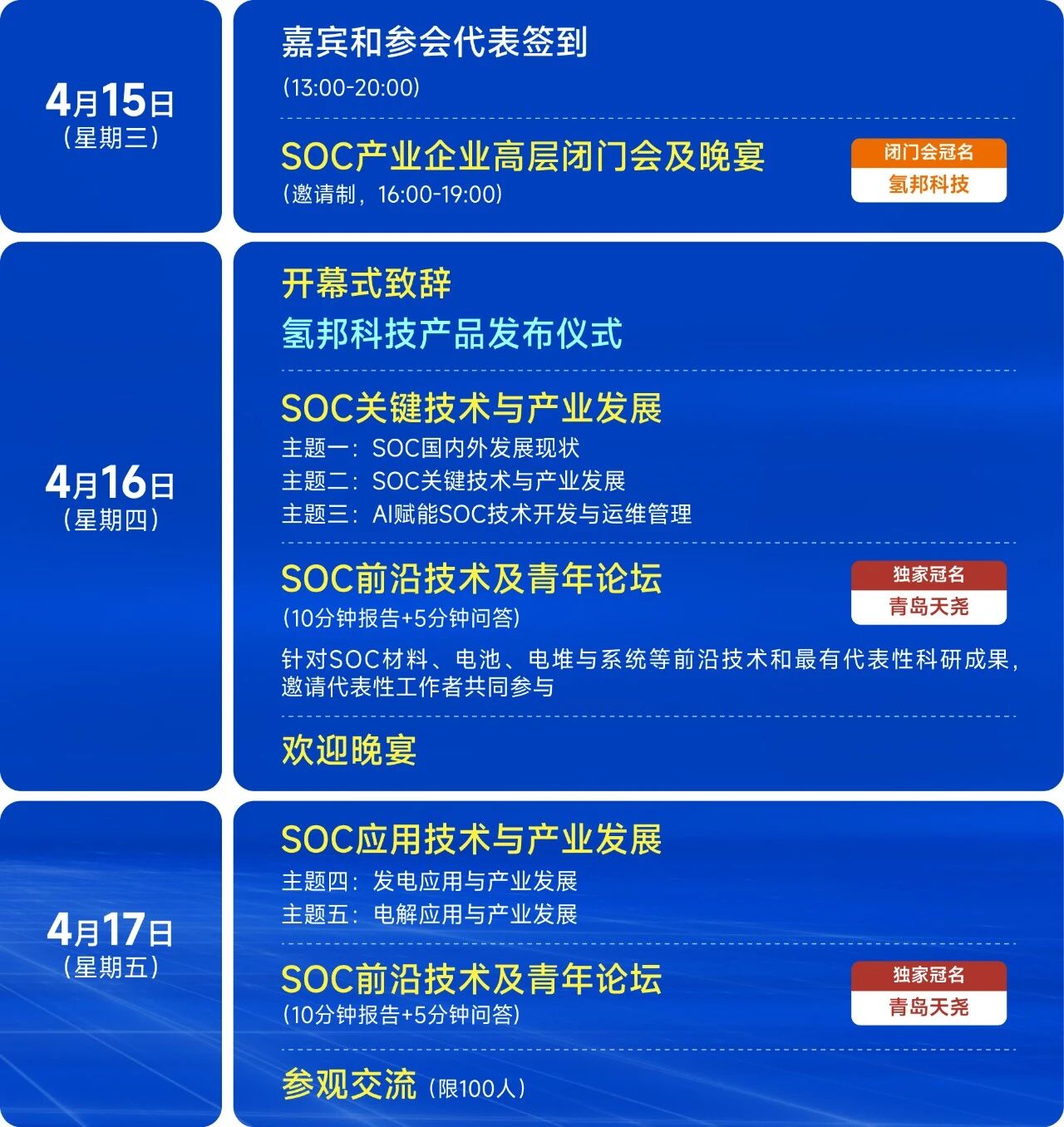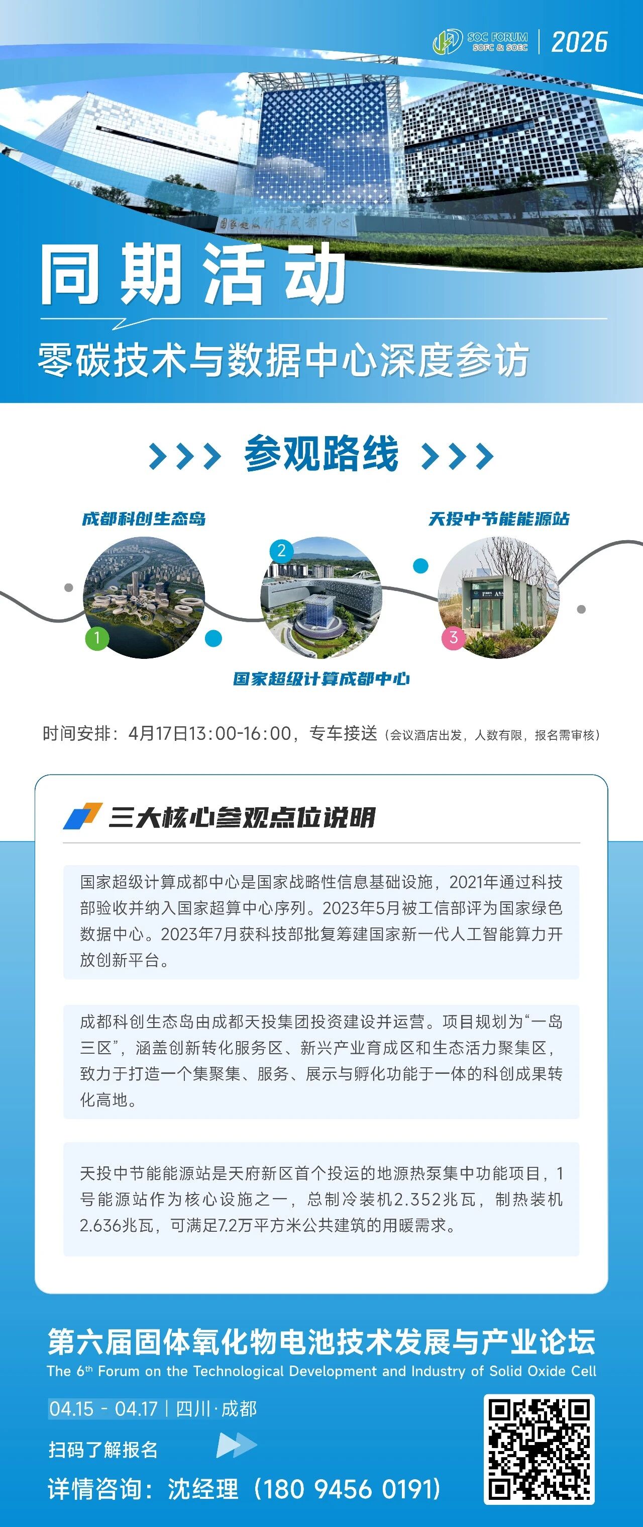 您好!由DT新能源主辦,天府永興實驗室聯合主辦,西南石油大學、全省先進燃料電池與電解池技術重點實驗室、江蘇省可再生能源學會燃料電池專委會、雅安雅瓷氫化新能源科技發展有限公司協辦的2026(第六屆)固體氧化物電池技術發展與產業論壇將于4月15-17日在成都秦皇假日酒店舉辦(15日下午會議簽到+SOC產業企業高層閉門會;16日、17日上午為主題報告;17號下午為實地參觀交流),感謝您在百忙之中出席本次會議。為大家能夠順利地參與本次會議,組委會準備了最全參會攻略,建議微信收藏,仔細閱讀!