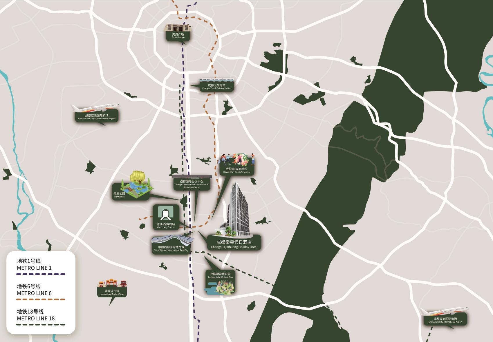 劍南大道,益州大道,天府大道,紅星路南延線,新成仁快速路,成自瀘高速均可到達酒店,距離第二繞城高速(西向)入口約10公里,需12分鐘
