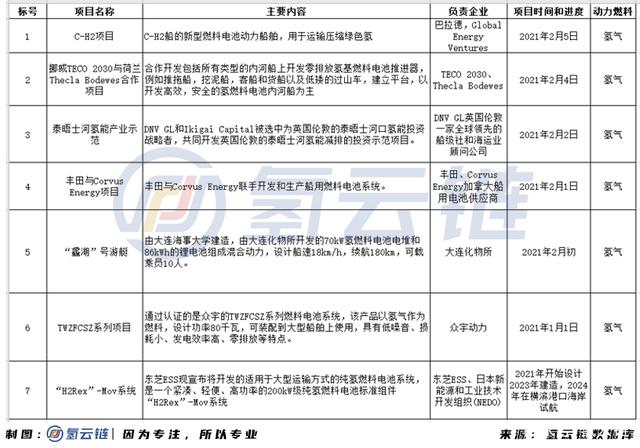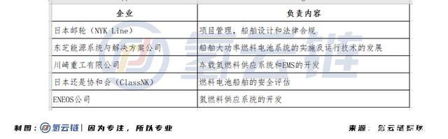 以日本游輪NYK Line項目為例,NYK Line將管理整個項目,同時協(xié)助船舶設計和法律合規(guī);東芝將在船上安裝大功率燃料電池系統(tǒng)并開發(fā)操作技術;川崎重工將負責開發(fā)船上的氫氣供應系統(tǒng)和能源管理系統(tǒng);Eneos負責開發(fā)氫燃料供應體系(該公司的前身為JXTG);日本船級社ClassNK將合作對已開發(fā)船只的安全性進行評估。