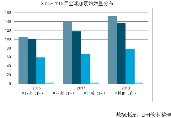 加氫站作為氫能源產(chǎn)業(yè)或者氫能源下游應(yīng)用發(fā)展的重要基礎(chǔ)設(shè)施,是各國建設(shè)布局的重點。數(shù)據(jù)顯示,2018年全球新增48座加氫站,截止到2018年底,全球加氫站數(shù)目達(dá)到369座。其中,歐洲地區(qū)加氫站擁有量為152座,位居世界第一;亞洲136座、北美78座,其他地區(qū)僅3座。此外,在全部369座加氫站中,有273座對外開放,可以像任何傳統(tǒng)的零售站一樣使用;其余的站點則為封閉用戶群提供服務(wù),比如公共汽車或車隊用戶。
