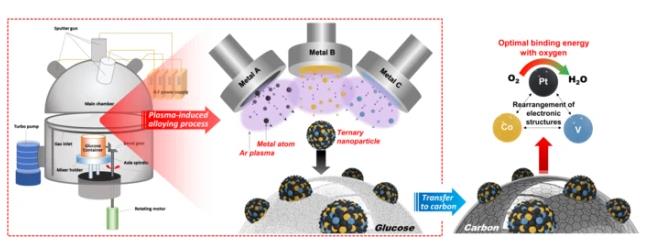 KIST研究團隊利用該技術合成了鉑鈷釩合金納米催化劑,并應用于氫燃料電池電極中的氧還原反應。與商業用作氫燃料電池催化劑的鉑和鉑鈷合金催化劑相比,該催化劑的活性高出7倍和3倍。此外,研究人員還研究了新添加的釩對納米顆粒中其他金屬的影響。通過計算機模擬,他們發現釩可以通過優化鉑-氧鍵能提高催化劑的性能。