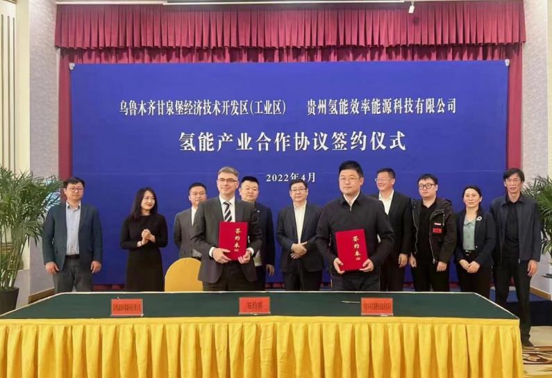 2022年4月15日,貴州氫能效率能源科技有限公司與烏魯木齊甘泉堡經濟技術開發區(工業區)管理委員會在烏魯木齊市舉行氫能產業合作協議簽約儀式。雙方以甘泉堡經開區為氫能產業合作核心區域,優勢互補,結合國際氫能技術及應用解決方案,共同開展氫能產業發展規劃和近期(三年)實施方案制定、氫能綜合應用、固定式質子交換膜燃料電池生產制造項目、燃料電池應用研究中心等合作,打造和推廣規?;瘹淠茉淳C合應用,形成可向烏魯木齊市域、全疆推廣、在行業內復制的應用模式。