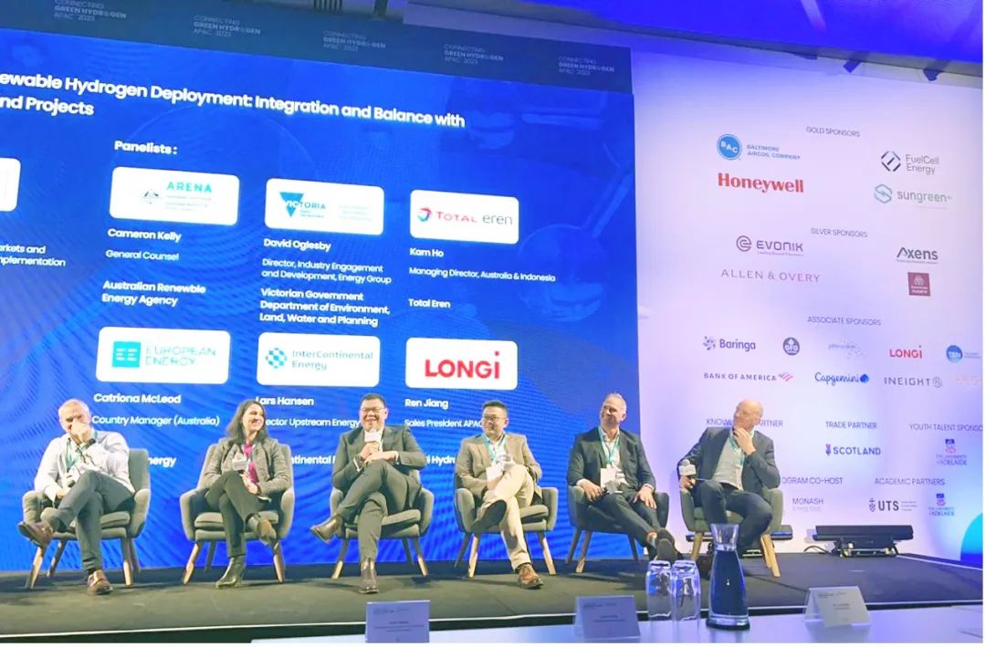 而就在近期,隆基氫能還應邀出席在澳大利亞舉辦的2023亞太綠色氫能發展峰會(Connecting Green Hydrogen APAC 2023)。亞太區域負責人蔣韌受邀出席峰會,與來自澳大利亞當地能源企業、政府、可再生能源機構等代表開展了以“可再生氫能部署:與風光項目的耦合與平衡”為主題的圓桌討論。