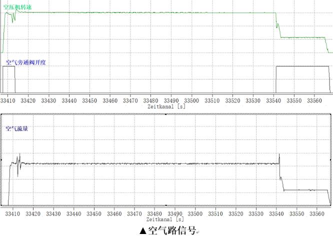 數(shù)據(jù)顯示,在車輛喚醒后進(jìn)行了3個階段的吹掃,分別是管路-電堆-管路,且每個階段的空氣流量都不同,其中電堆內(nèi)的吹掃時間最長,占比77%,吹掃完電堆后對管路進(jìn)行了一個簡短且較低流量的吹掃。